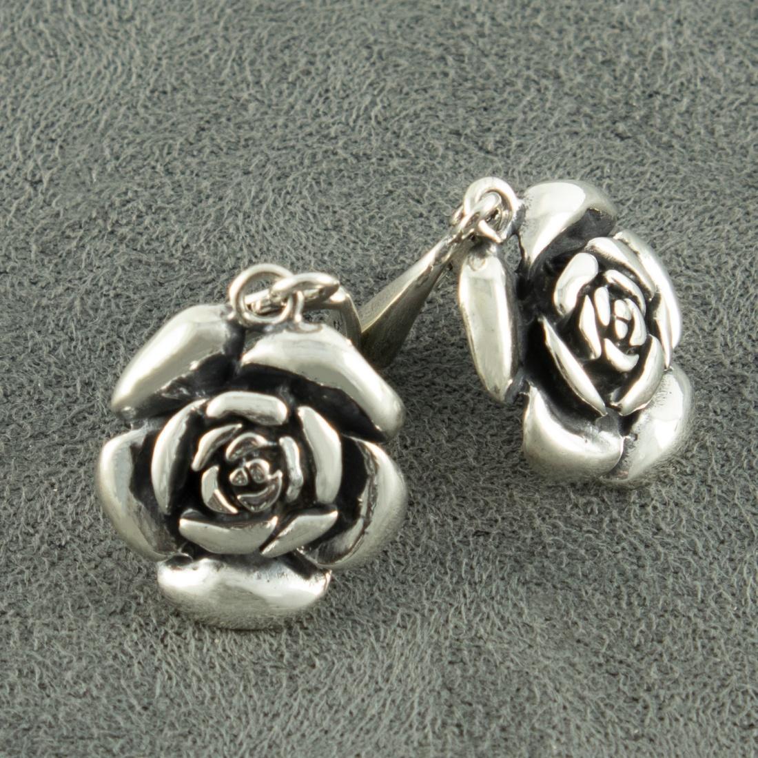 Дамски сребърни обеци “Роза”, ръчно изработени от Студио Николас, модел 594 E. Част от комплект: гривна с рози, пръстен с роза, уникален дизайн с цветя.
