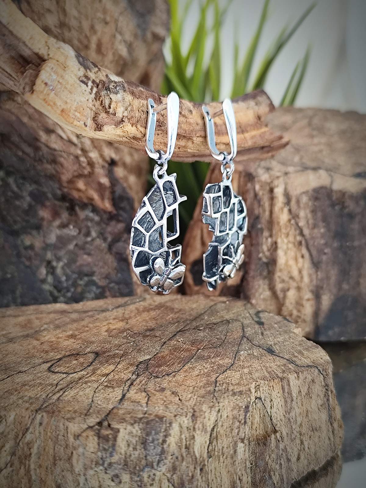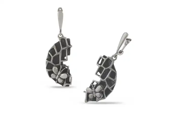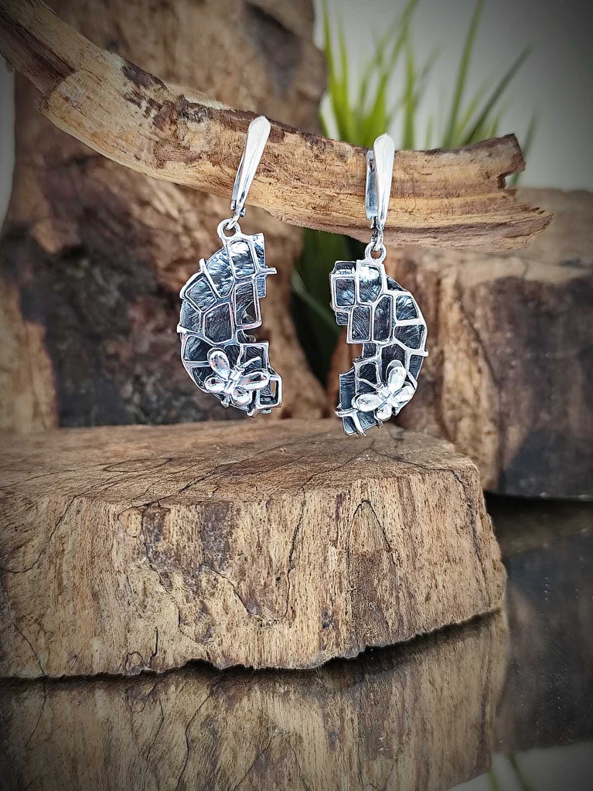Дамски сребърни обеци 769E. Сребърни обеци във формата на полукръгла плочка с монтирани клетчици и “кацнали” сребърни пеперуди. Висящ модел обици от сребро 769E Студио Николас. Подаръчен комплект : пръстен, гривна, медальон и обеци. Nikol@s е изкуството, с внимание към всеки детайл. Ръчна изработка, 925 проба, сребърна красота!