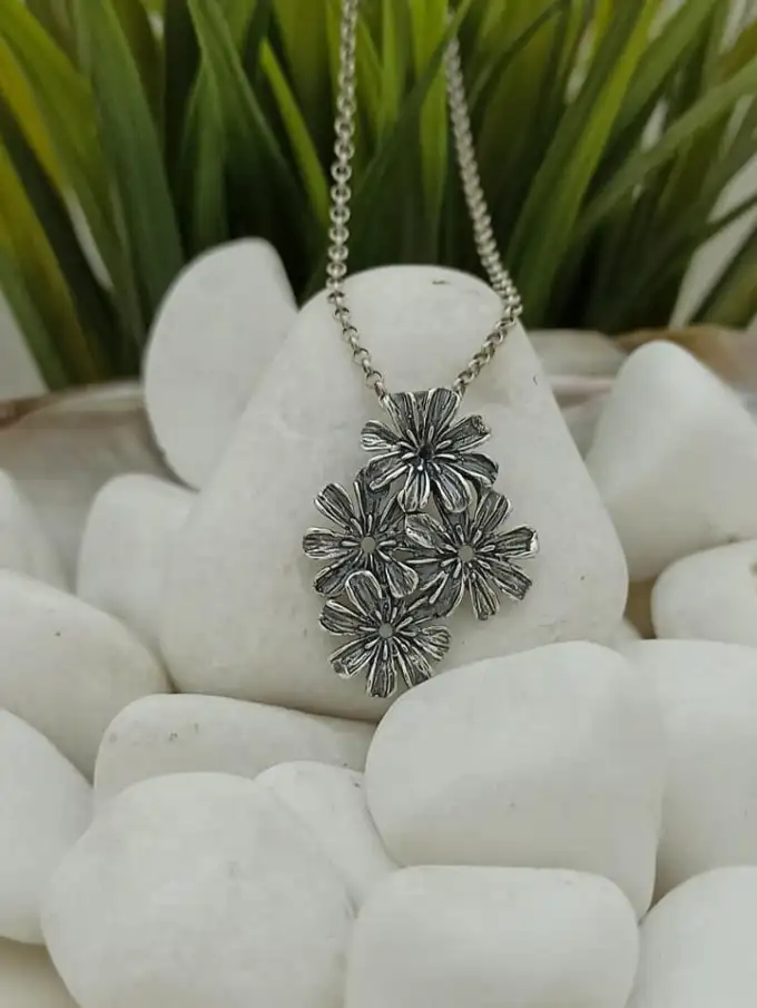 Шоколадовият космос е рядко и невероятно красиво цвете, родом от Мексико. Цъфти в края на лятото и вечер, получавайки името си от аромата на шоколад. Цветът му е наситено червен или кафяв. Цветето символизира красотата, страстта и уникалността. Дамски сребърен медальон с цветя, модел 1164M от Студио Николас. Ръчно изработен сребърен комплект от обеци, гривна и медальон. Размери: 28мм./21мм. медальона се предлага без верижка.