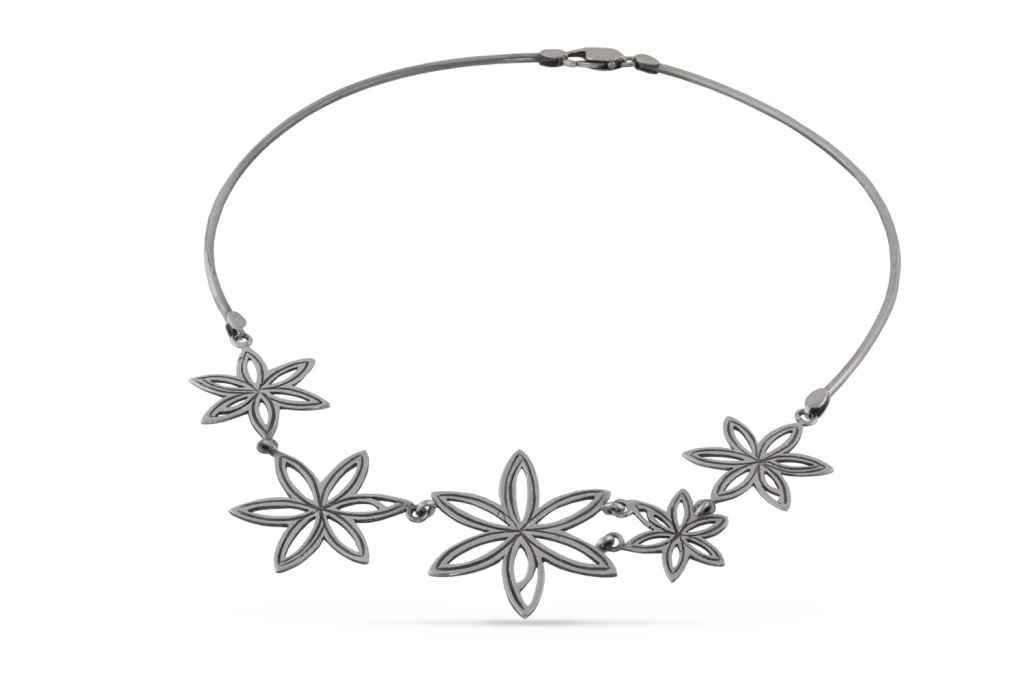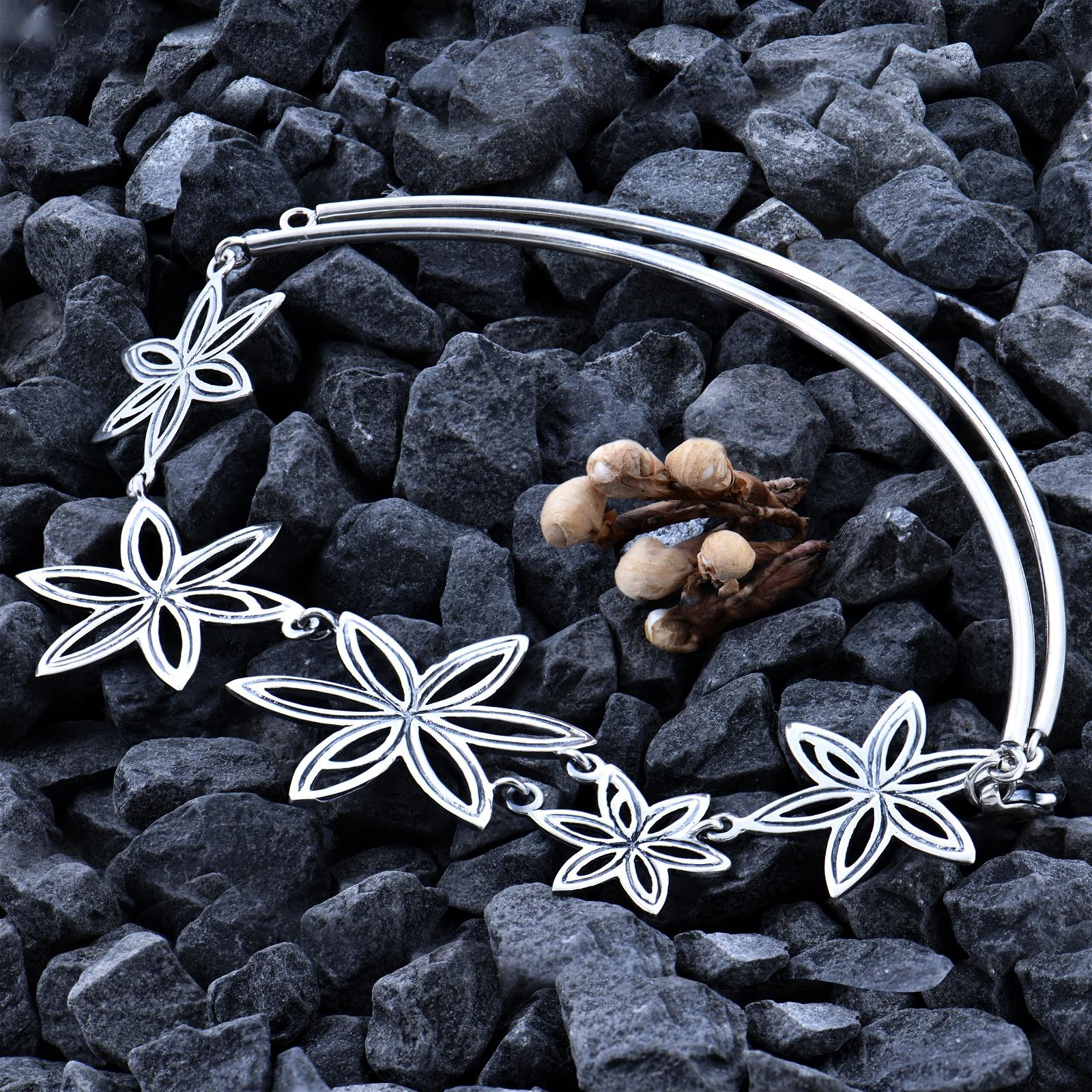 Елегантно сребърно твърдо колие, вдъхновено от красотата на цветето далия. Пет изящни цветя, свързани с малки халкички, създават усещане за движение и хармония.