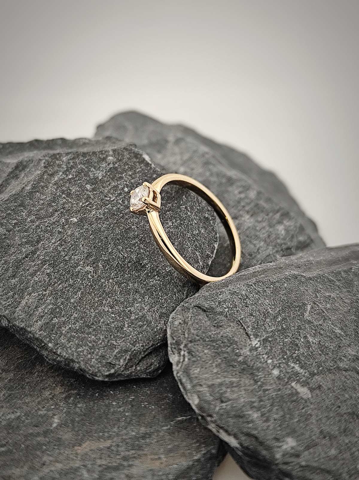 Елегантен златен годежен пръстен „YARA“ с централен бял циркон. Изчистен и романтичен модел, вдъхновен от славянската символика на младата любов и новото начало.
