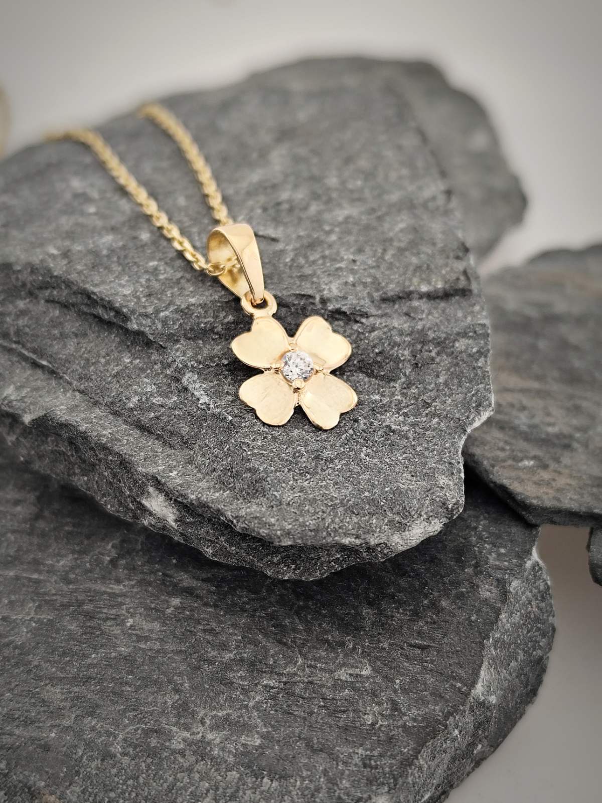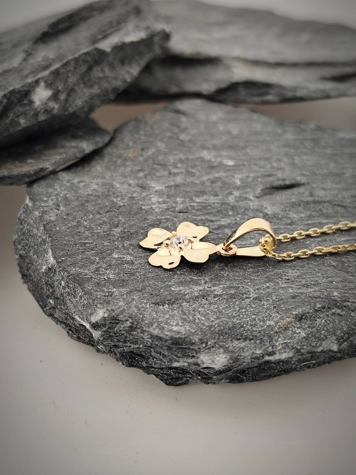 Нежен златен медальон във формата на детелина с инкрустиран циркон в центъра. Деликатно бижу от 14-каратово злато, което носи символика на късмет, надежда и закрила.