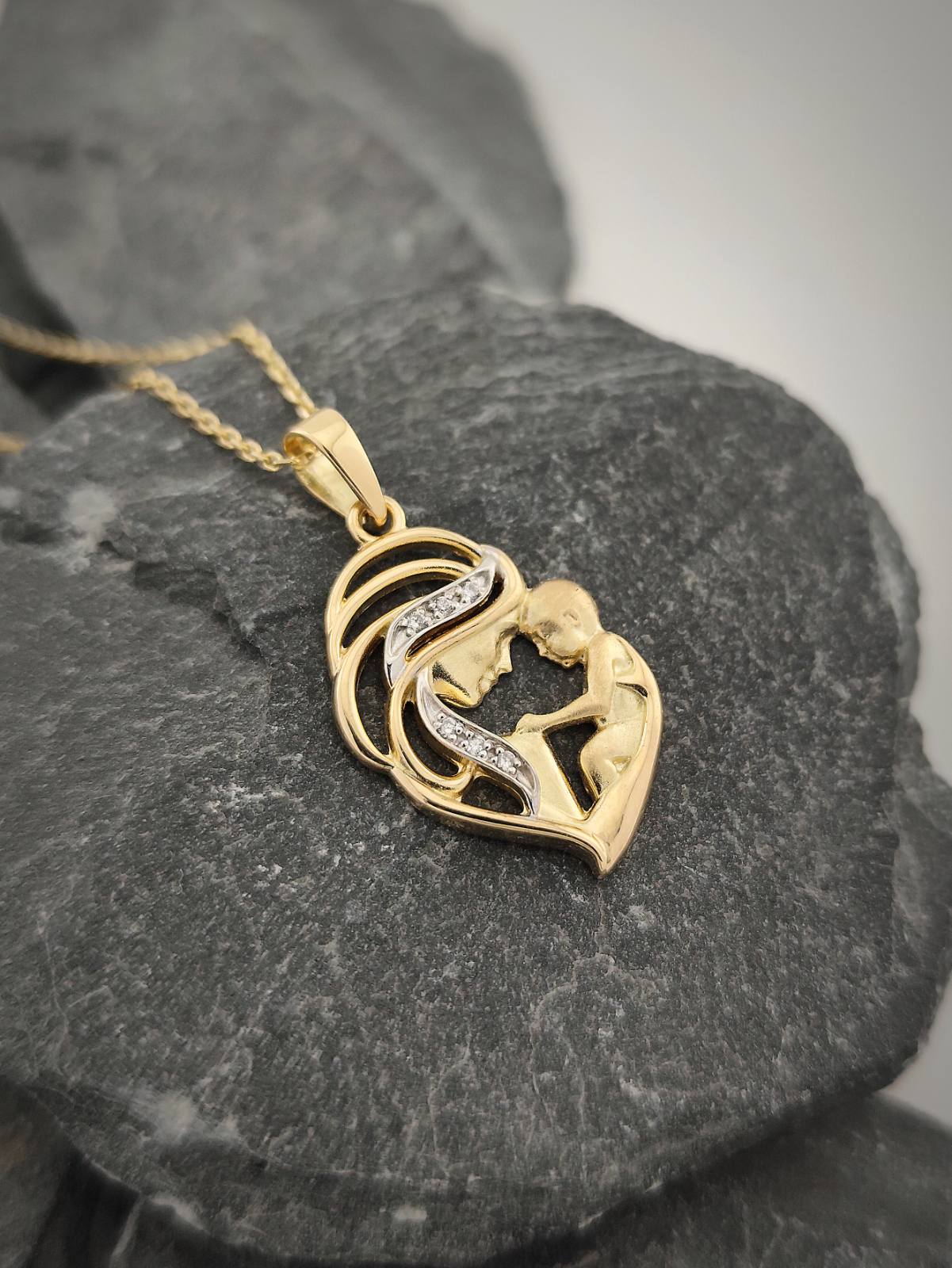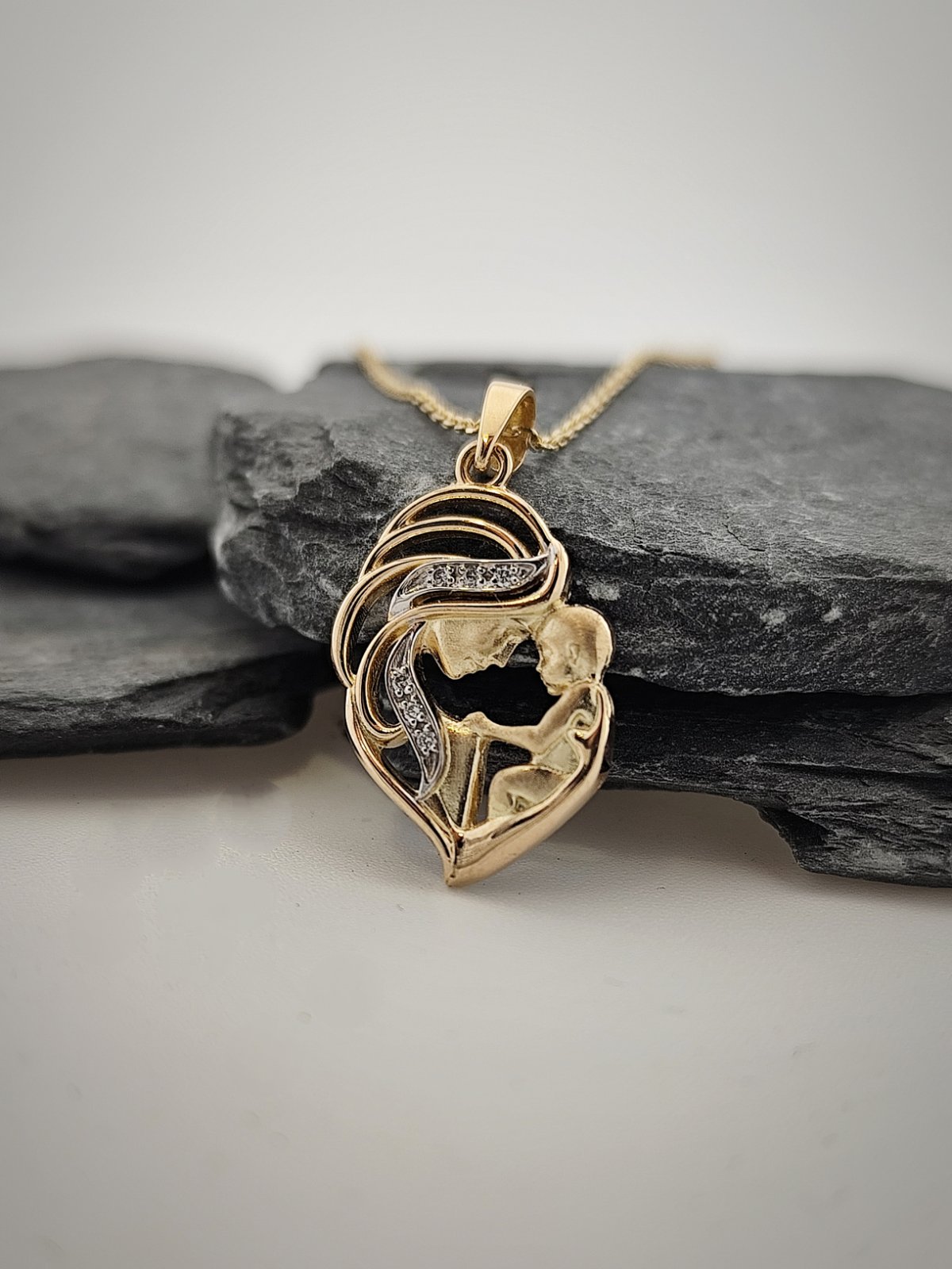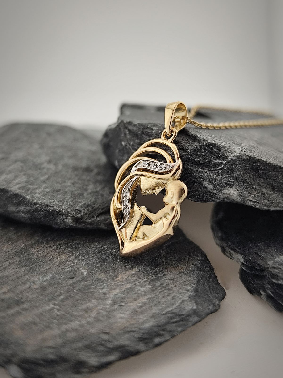 Луксозен медальон „Майчина прегръдка“, изработен от 14 каратово злато с инкрустирани циркони. Символ на любов, нежност и вечна връзка между майка и дете.