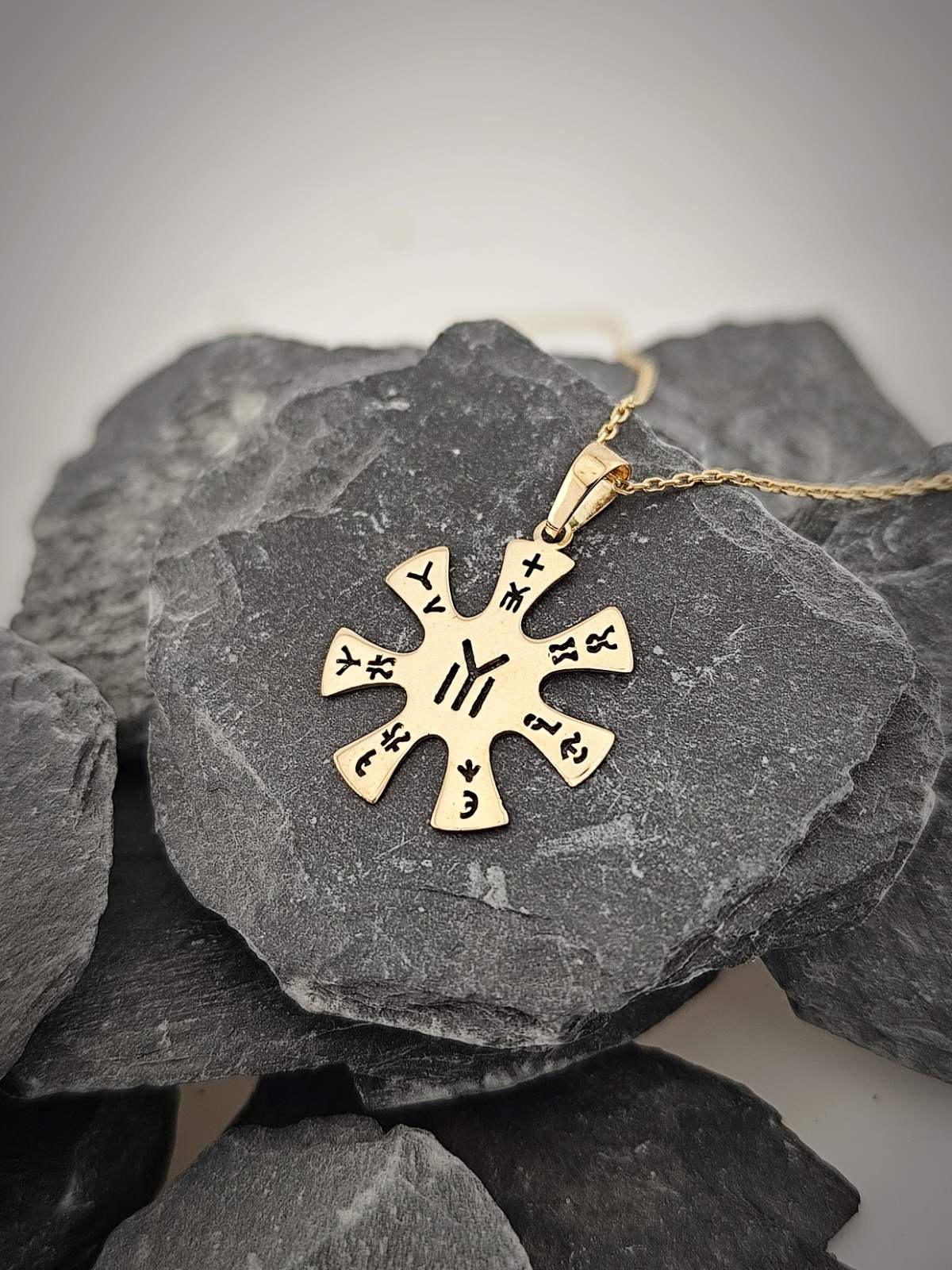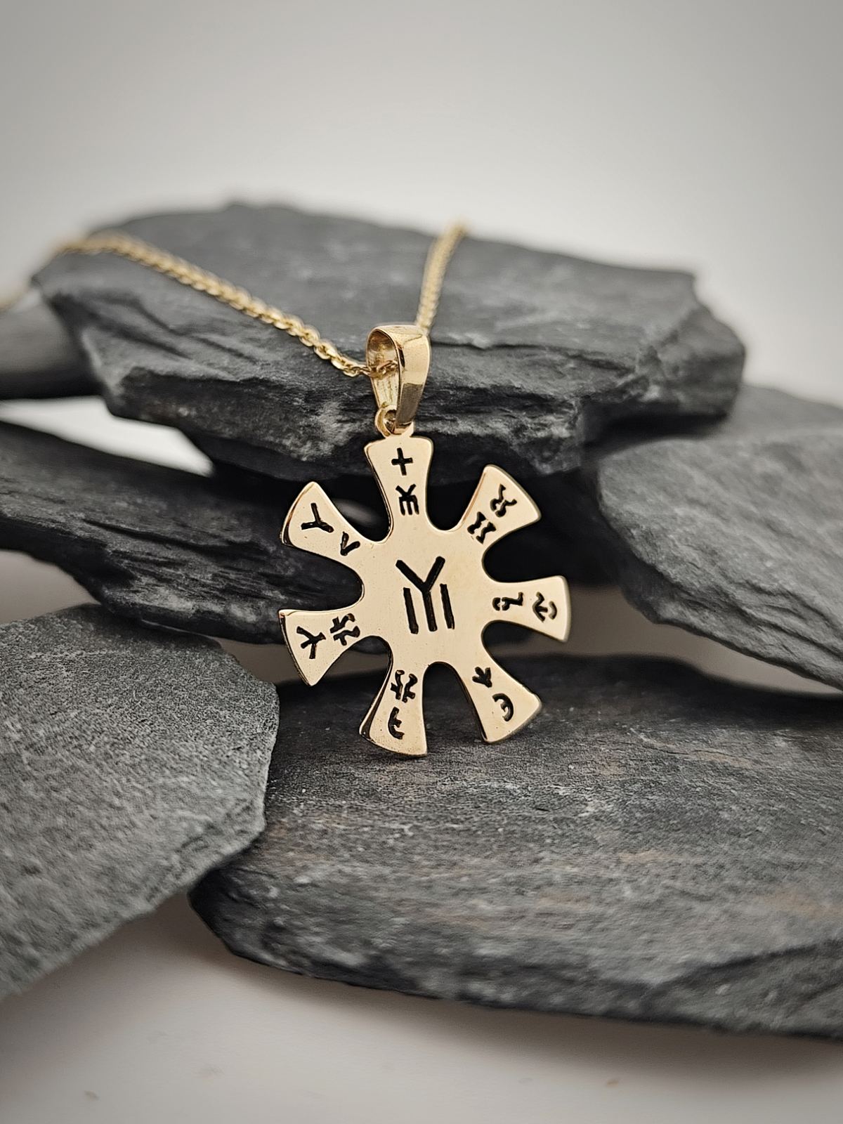 Медальонът е изработен от 14-каратово злато с прецизна обработка на символите.