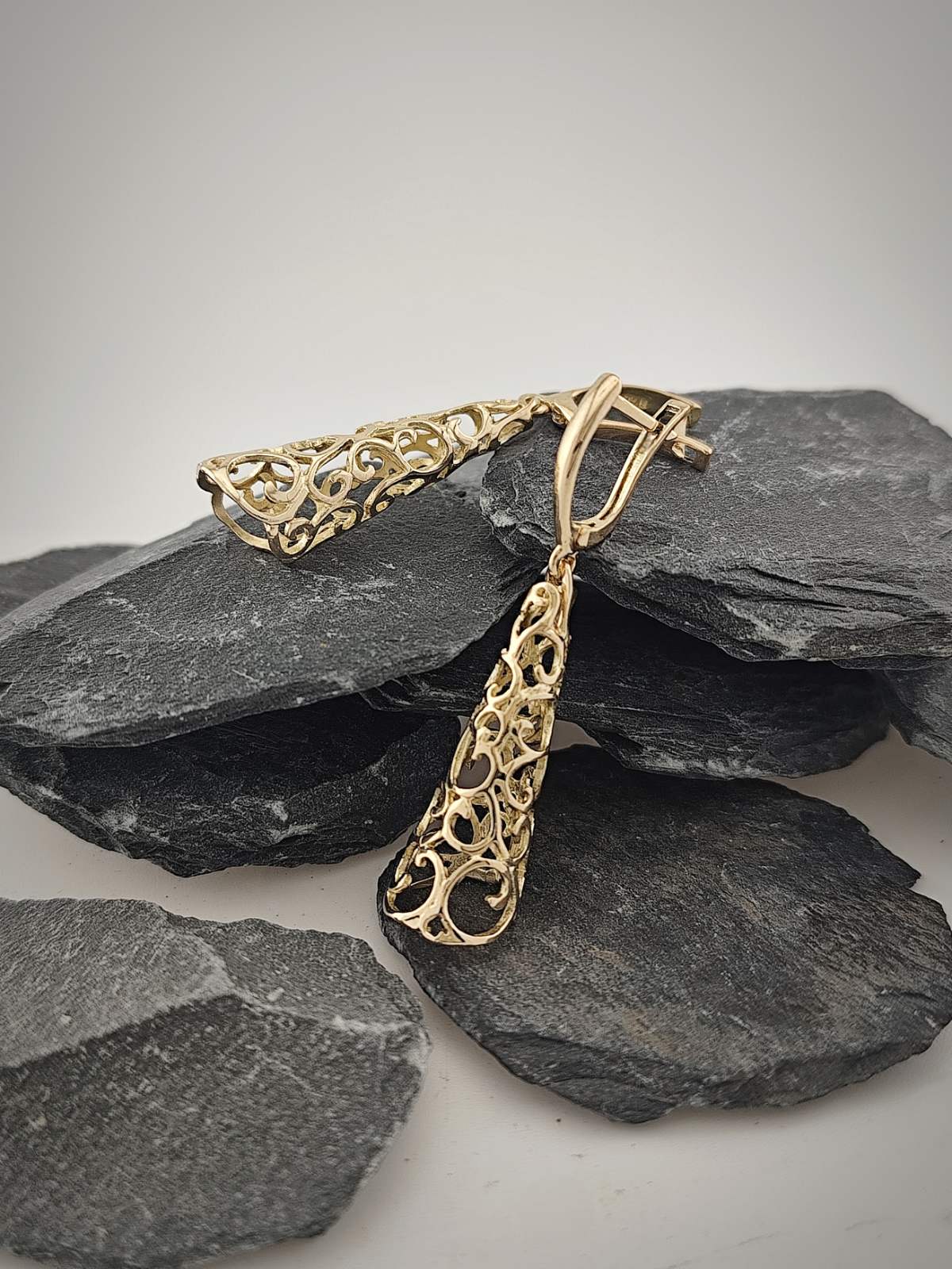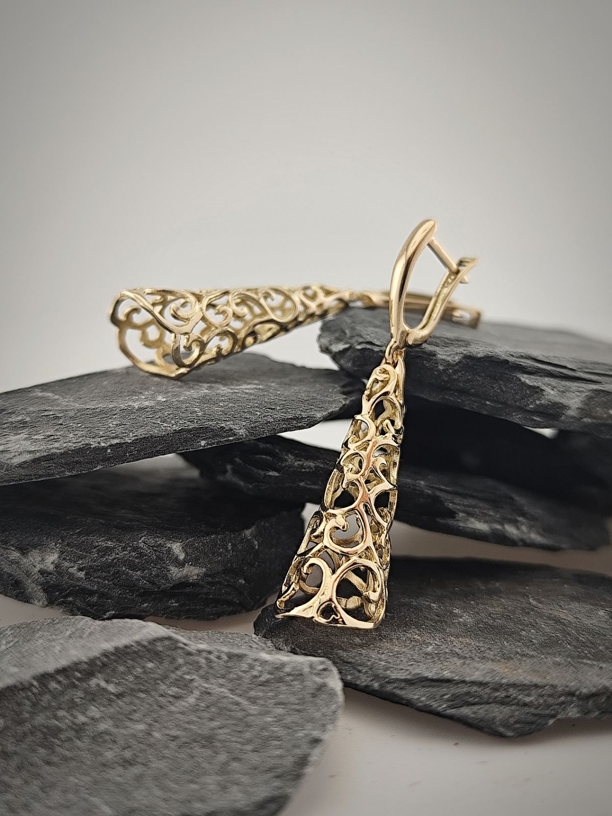 Златни ажурни обеци „Конус“ впечатлява със своята издължена форма и фина ажурна структура. Силуетът на конуса създава усещане за движение и баланс, а внимателно изработените орнаменти образуват деликатна игра на светлина и сенки.